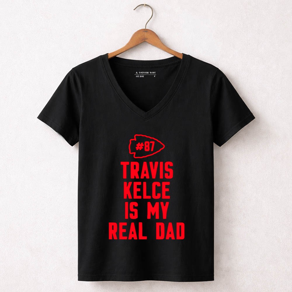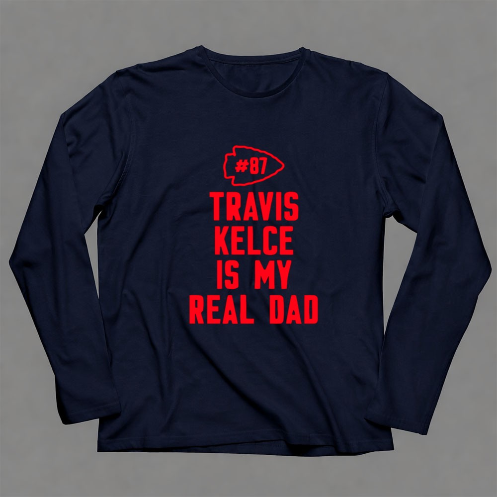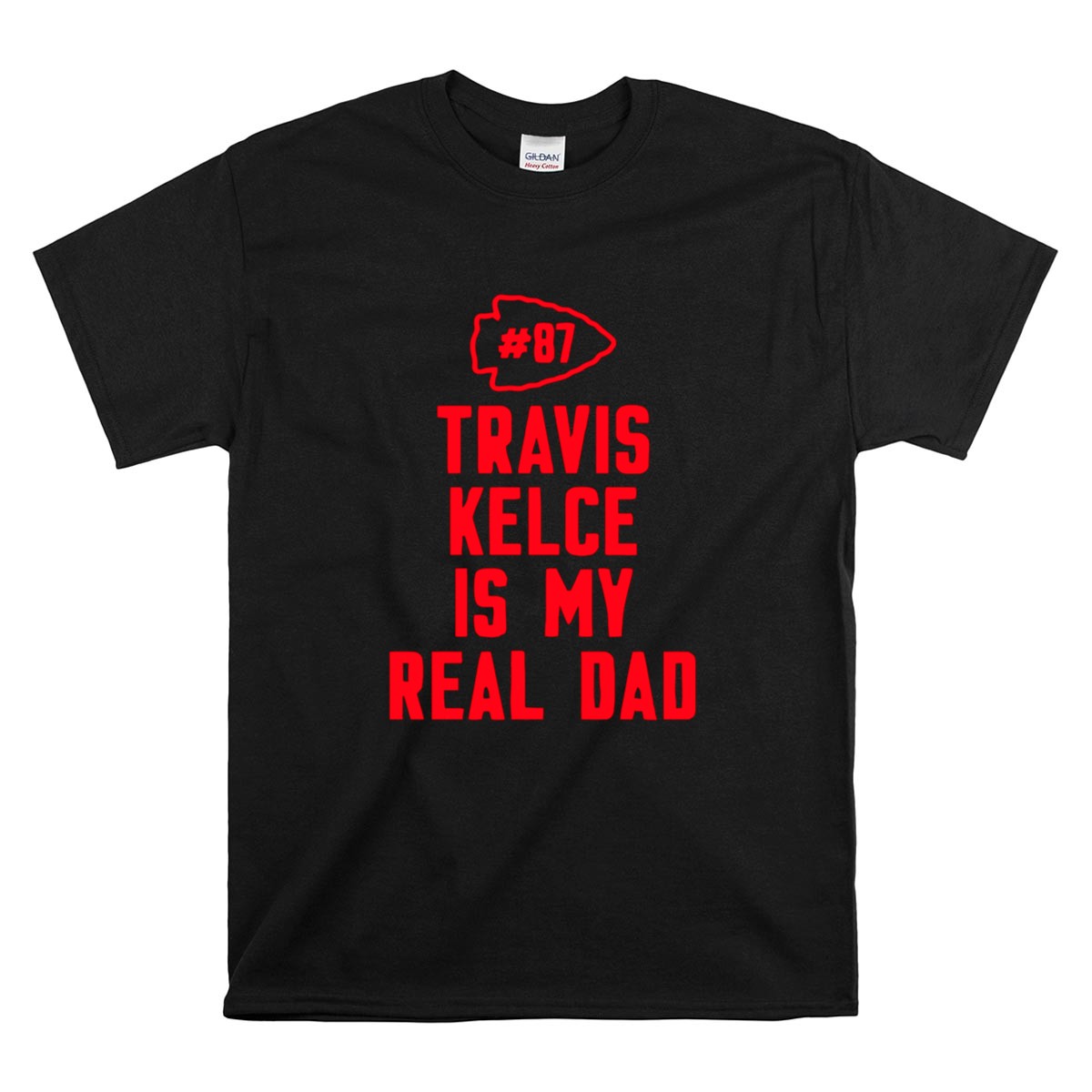 This shirt captures the lighthearted spirit of sports fandom, blending humor with a bold statement. The phrase ‘#87 TRAVIS KELCE IS MY REAL DAD’ playfully honors the unique bond between fans and the football legend, making it a standout piece for any Chiefs supporter. It embodies a sense of pride and community at Arrowhead Stadium and beyond.