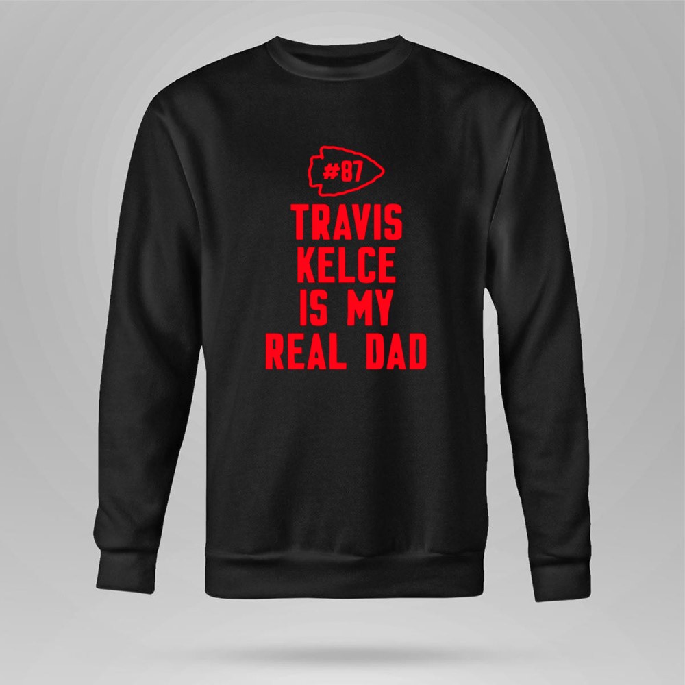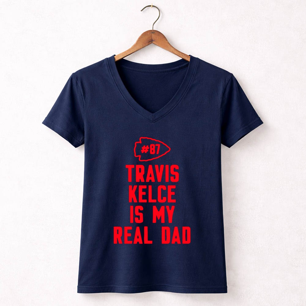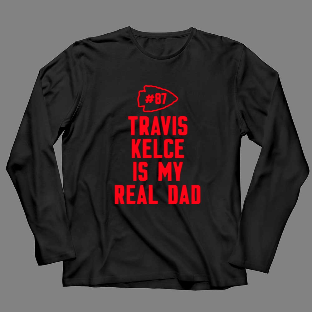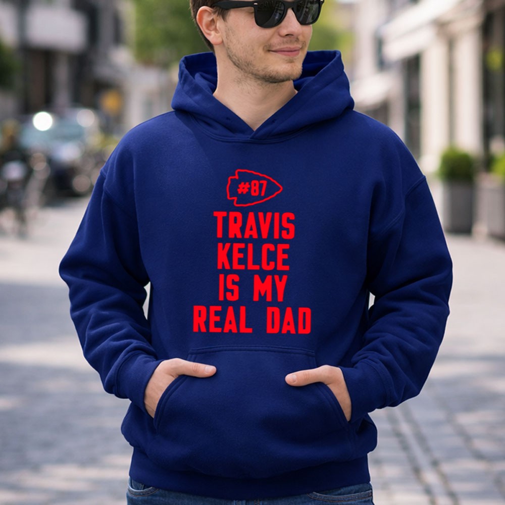 This shirt captures the lighthearted spirit of sports fandom, blending humor with a bold statement. The phrase ‘#87 TRAVIS KELCE IS MY REAL DAD’ playfully honors the unique bond between fans and the football legend, making it a standout piece for any Chiefs supporter. It embodies a sense of pride and community at Arrowhead Stadium and beyond.