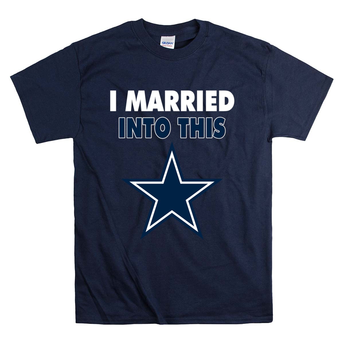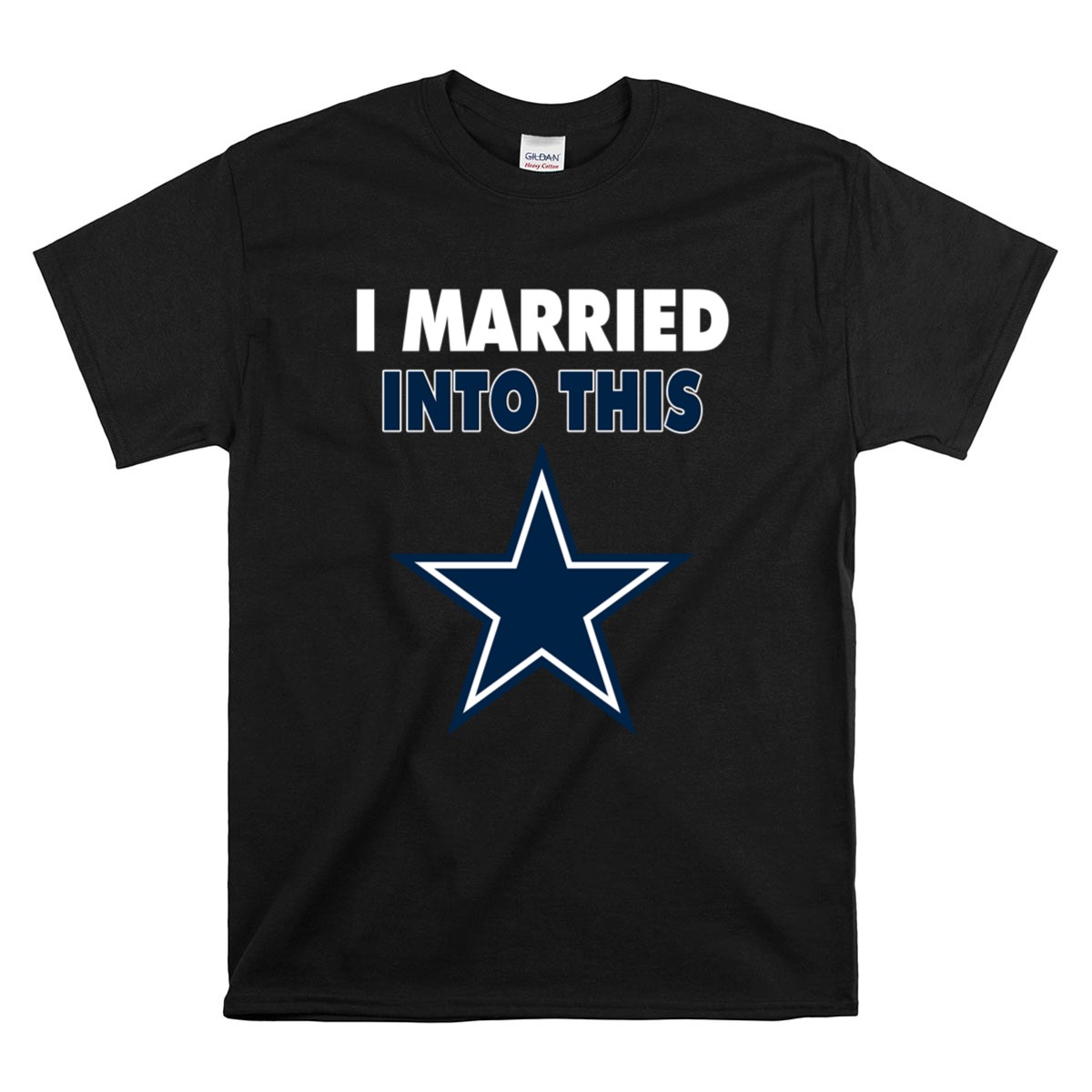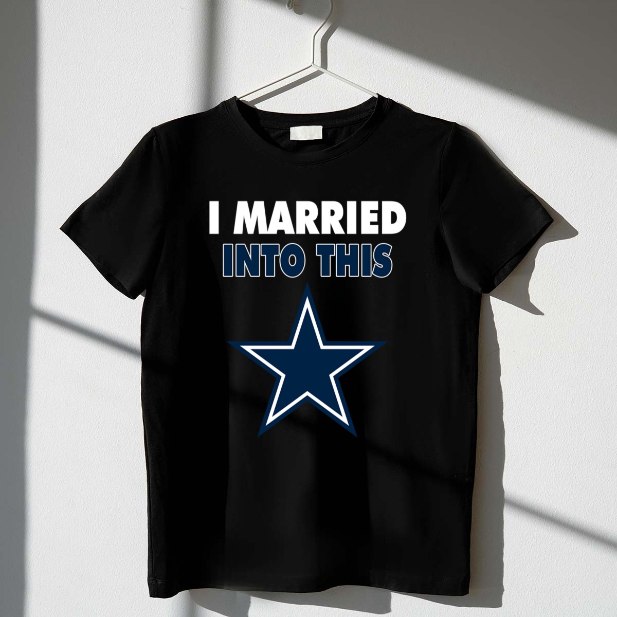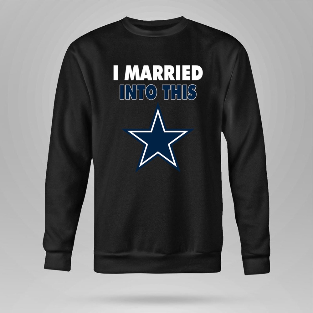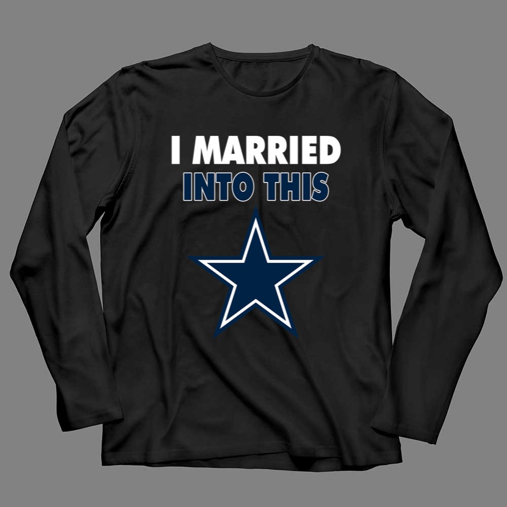 This design captures the essence of merging love with the excitement of Dallas Cowboys fandom. The playful slogan, paired with modern typography and the iconic blue star emblem, reflects the joy of being part of a family that thrives on NFL spirit. It’s a tribute to the camaraderie and loyalty that comes with marrying into a sports-loving community.