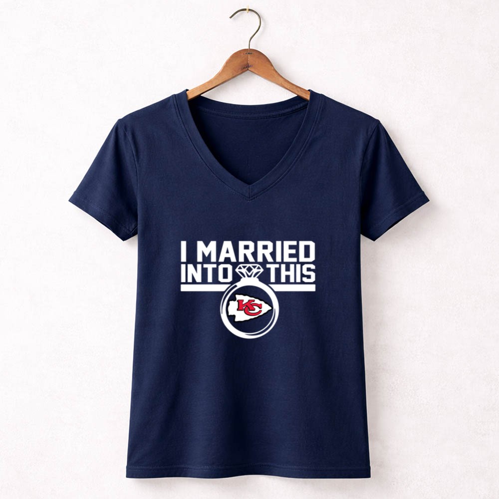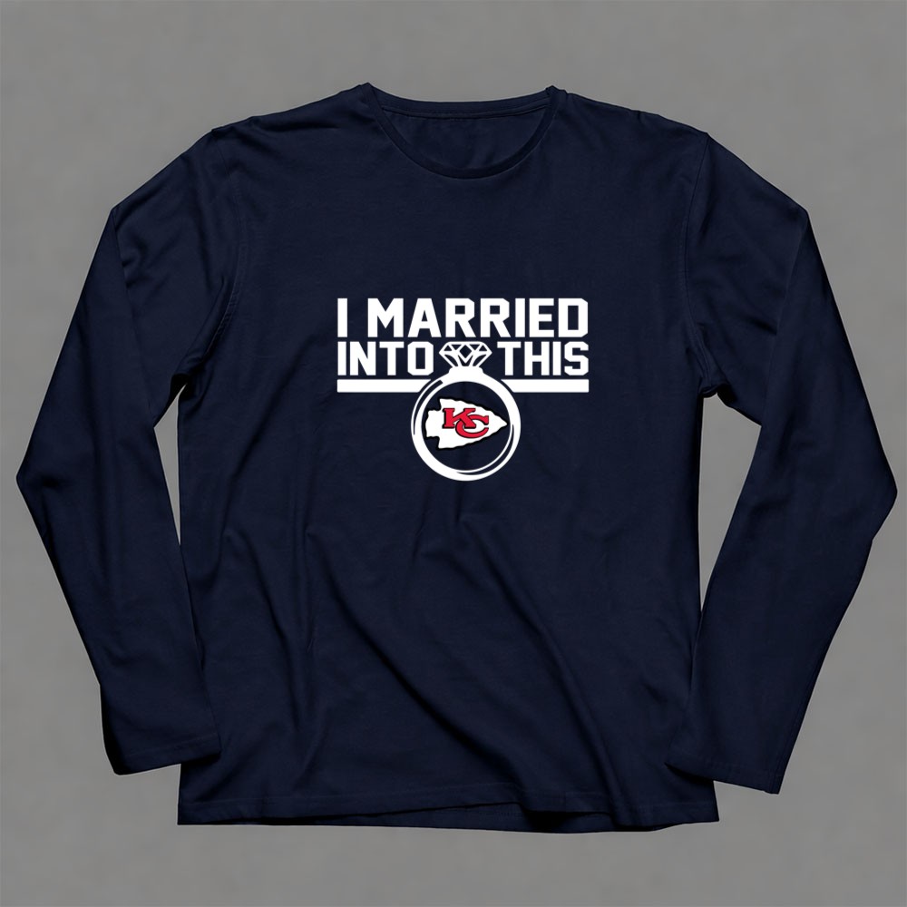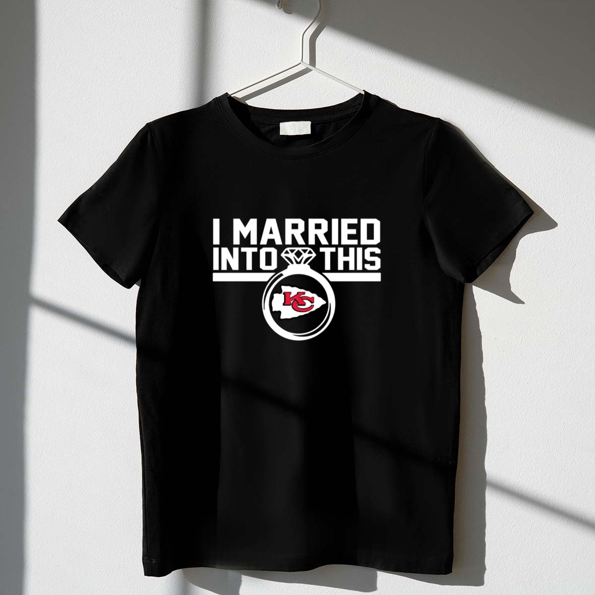 This design captures the playful essence of becoming part of the Chiefs family through marriage, blending sports love with personal joy. The phrase ‘I MARRIED INTO THIS’ alongside the iconic Kansas City Chiefs logo speaks to the pride and humor that comes with embracing a partner’s passion for football. It’s a tribute to the fun dynamics of fandom, celebrated in bold typography.