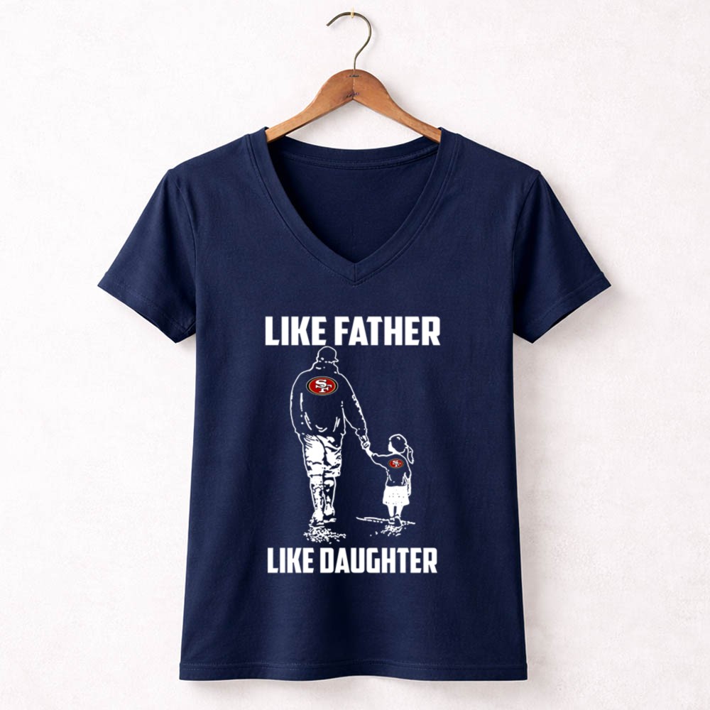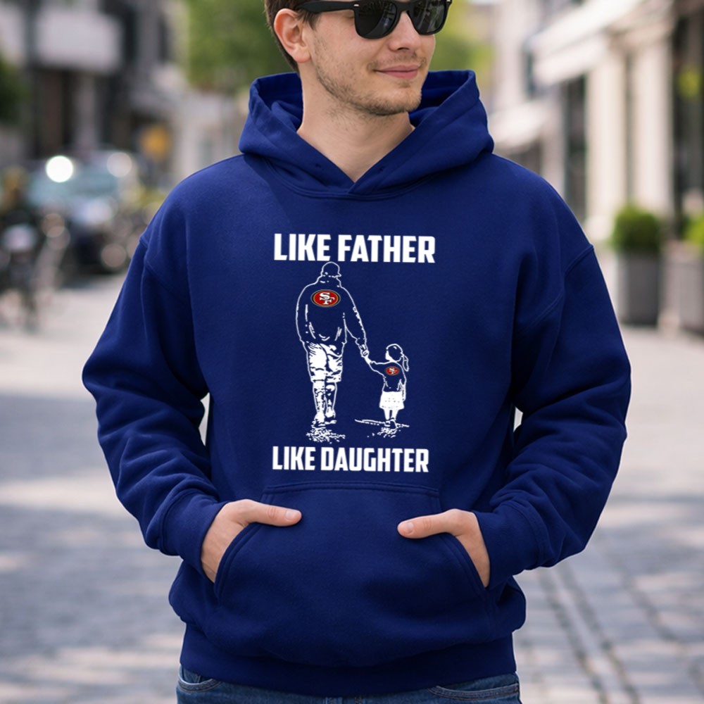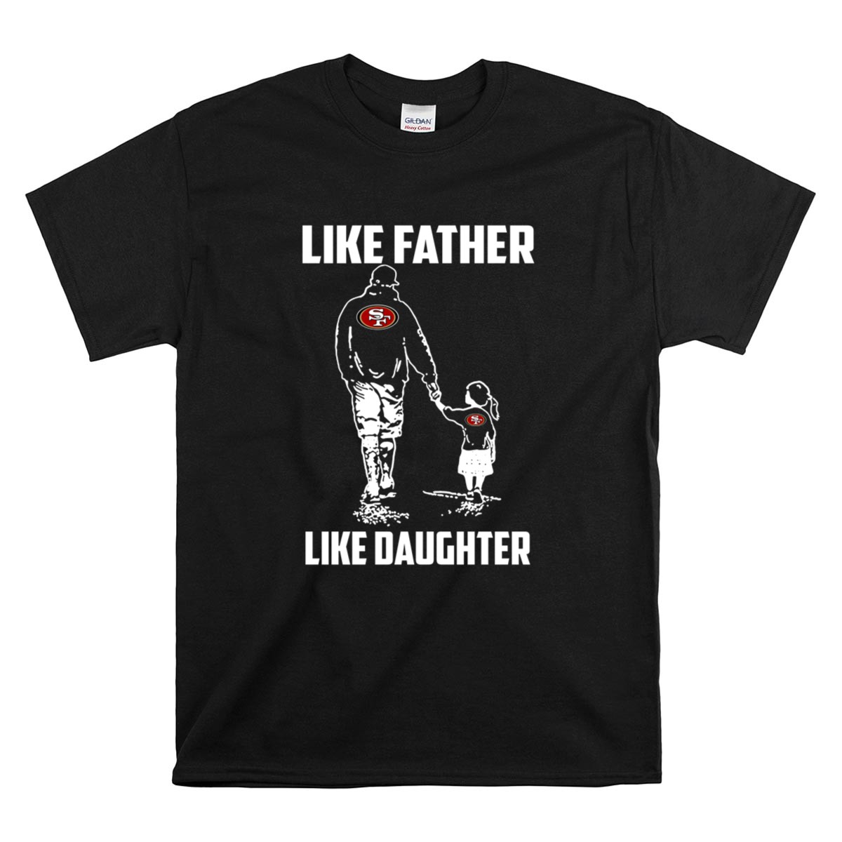 This design encapsulates the essence of family and loyalty, showcasing the iconic San Francisco 49ers logo as a symbol of shared passion. The minimalist aesthetic reflects modern streetwear while celebrating the unbreakable bond between father and daughter. Together, they embrace their love for the game and the cherished memories created at Levi’s Stadium.