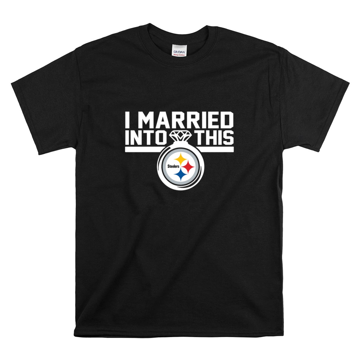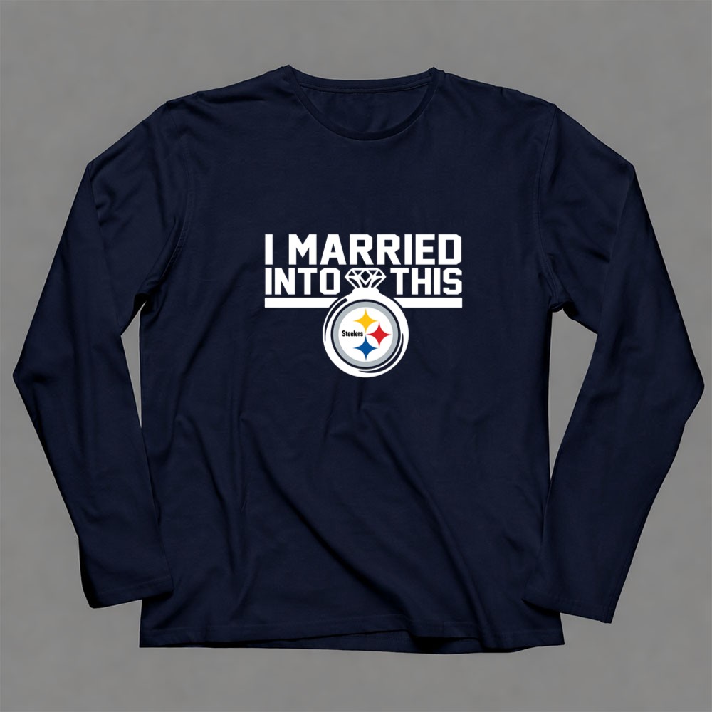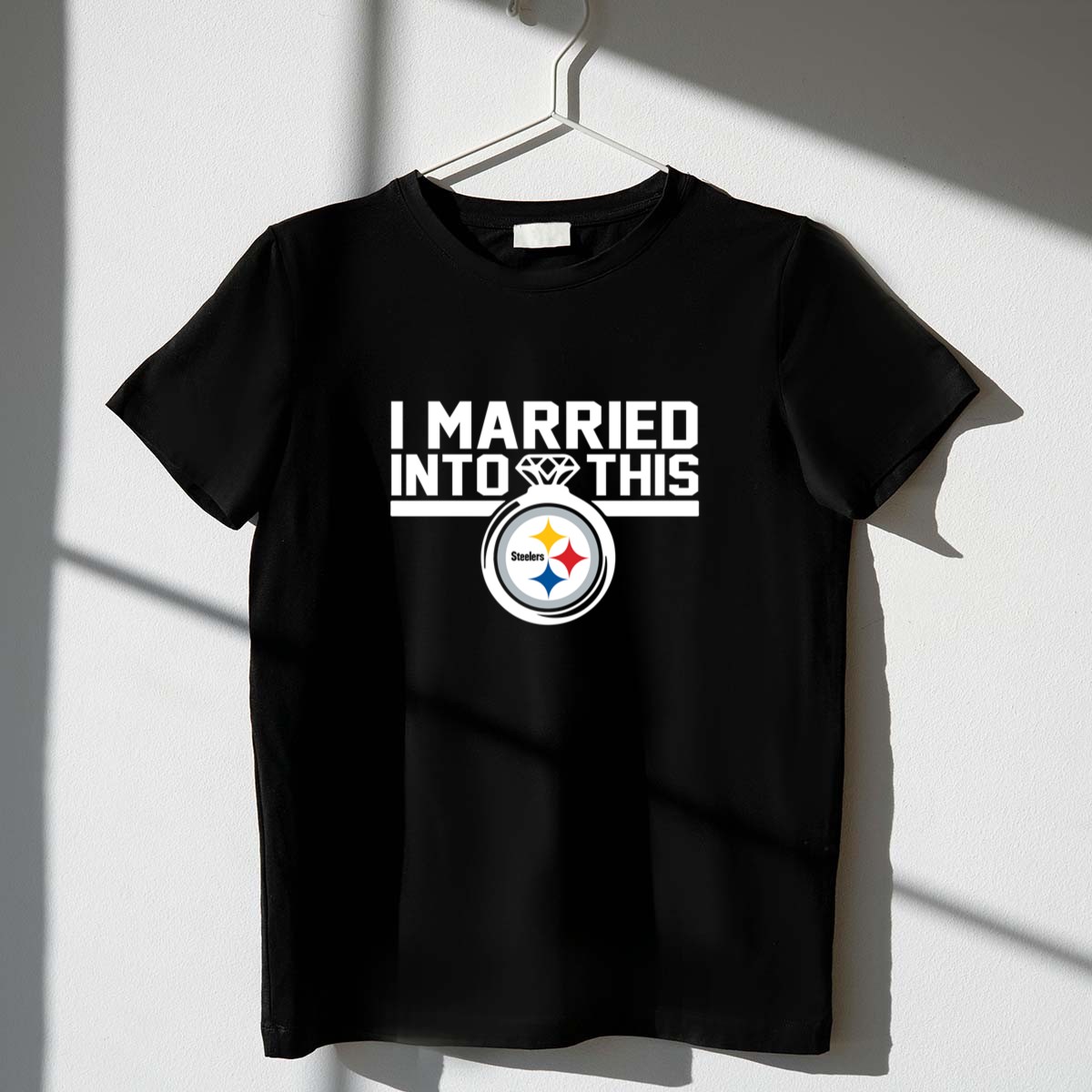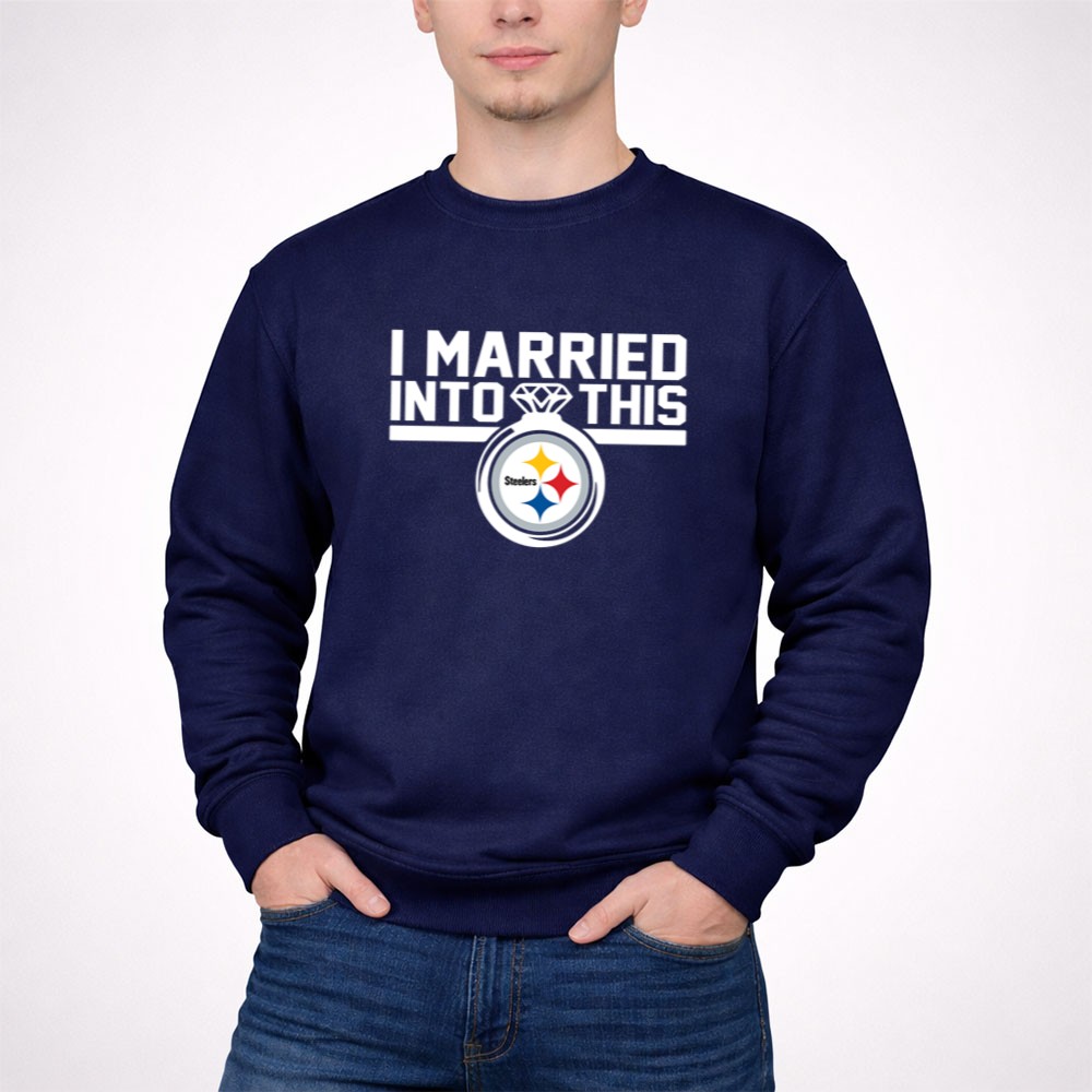 This shirt captures the joy of blending family ties with the thrill of Pittsburgh Steelers fandom. It’s a lighthearted declaration, ‘I Married Into This,’ that showcases not just allegiance to the team, but also the pride in joining a football family. With its minimalist design and humorous twist, it brings together the love of sports and the joy of marriage in one striking statement piece.