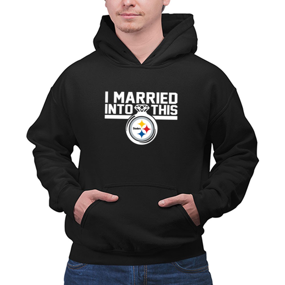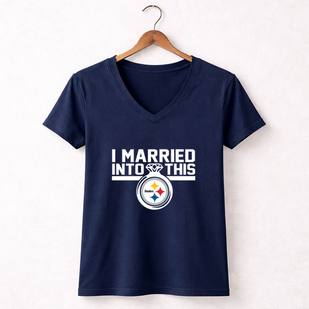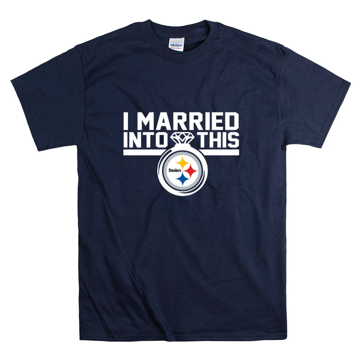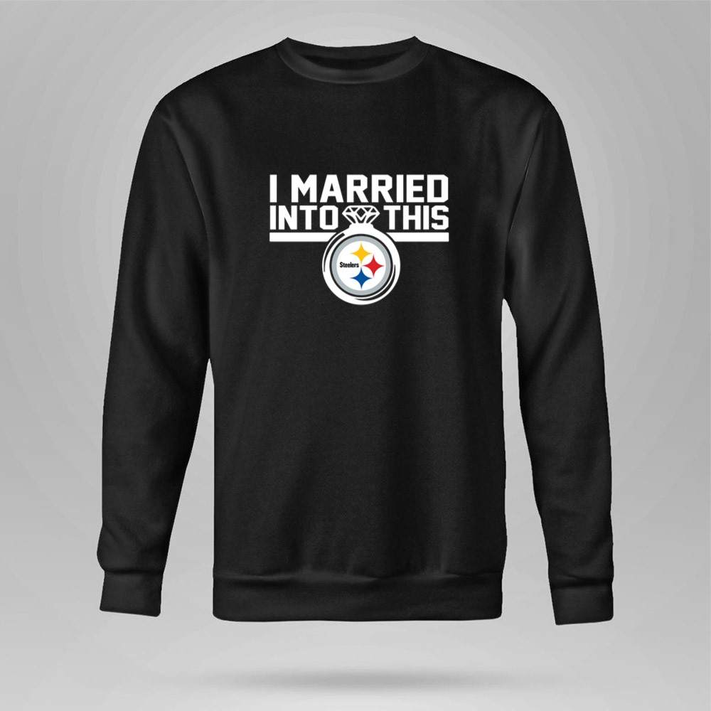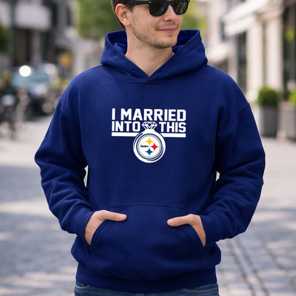 This shirt captures the joy of blending family ties with the thrill of Pittsburgh Steelers fandom. It’s a lighthearted declaration, ‘I Married Into This,’ that showcases not just allegiance to the team, but also the pride in joining a football family. With its minimalist design and humorous twist, it brings together the love of sports and the joy of marriage in one striking statement piece.