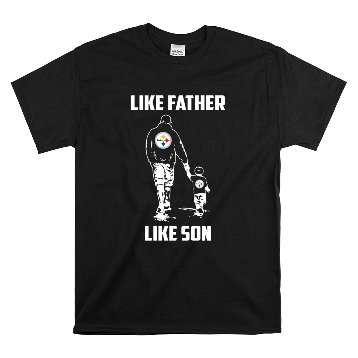 This design captures the essence of family and football, showcasing the iconic Pittsburgh Steelers logo as a symbol of unity and pride. The minimalist black and white silhouette reflects a timeless sentiment, celebrating the special bond between fathers and sons who share a love for the game. It’s a warm reminder of cherished memories made under the stadium lights.