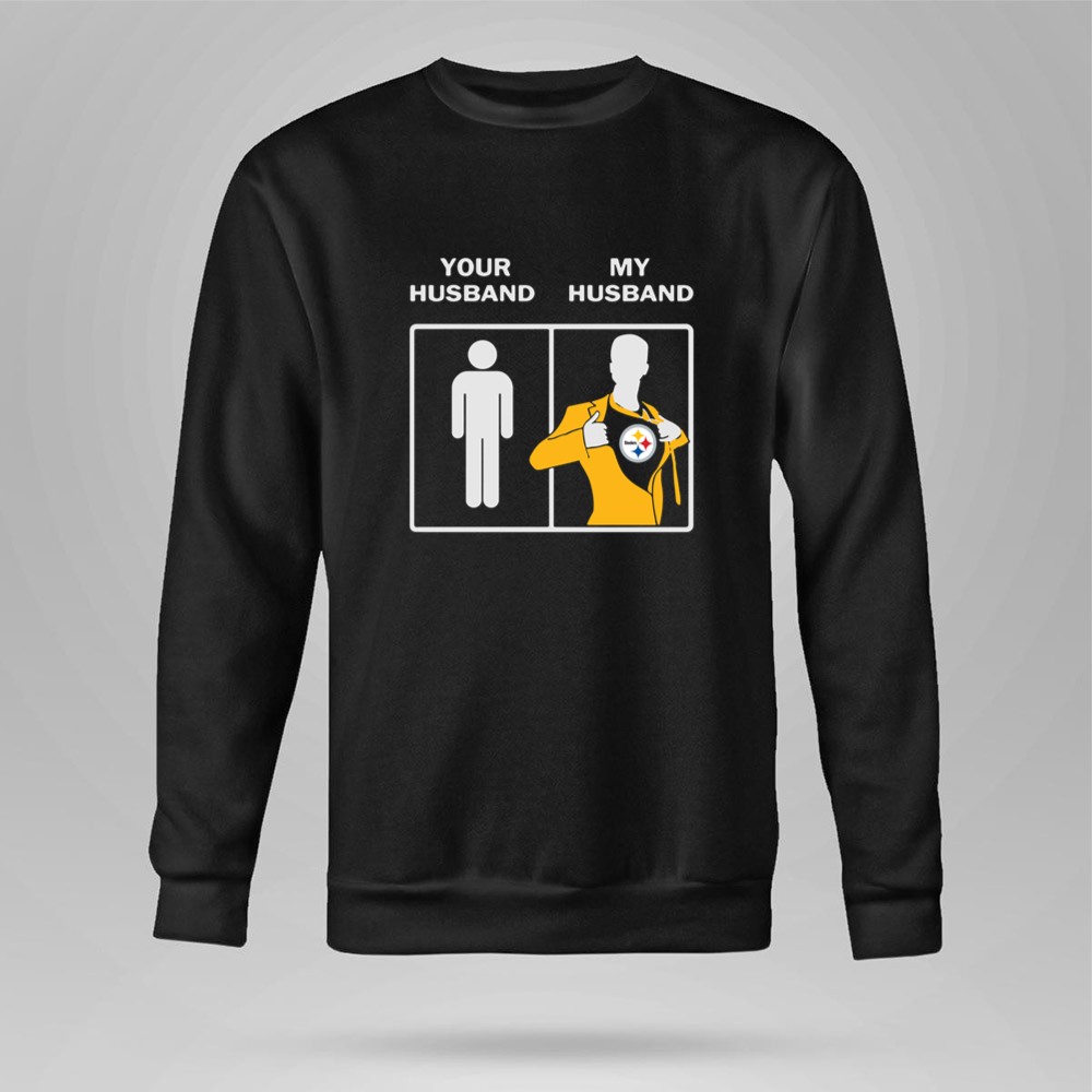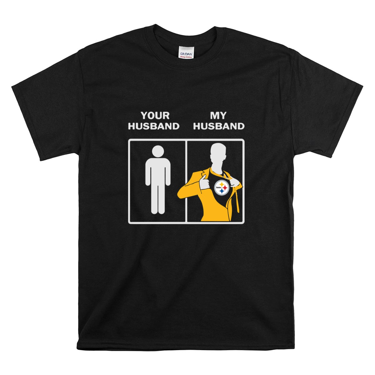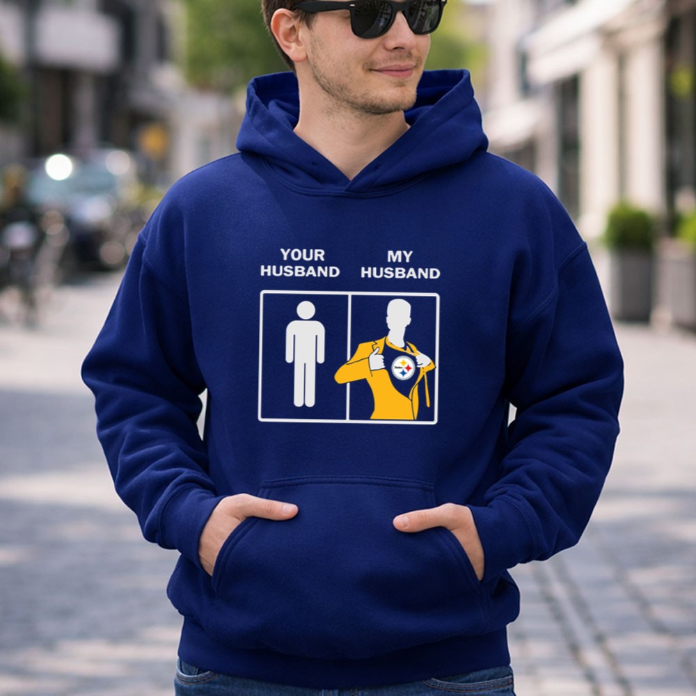 This design playfully captures the essence of Steelers fandom by displaying the phrase ‘YOUR HUSBAND, MY HUSBAND’ alongside a bold graphic of a man revealing the iconic Pittsburgh Steelers logo. It’s a lighthearted nod to the dedication and camaraderie that defines the football-loving community, making it a perfect expression of love for both the game and each other.