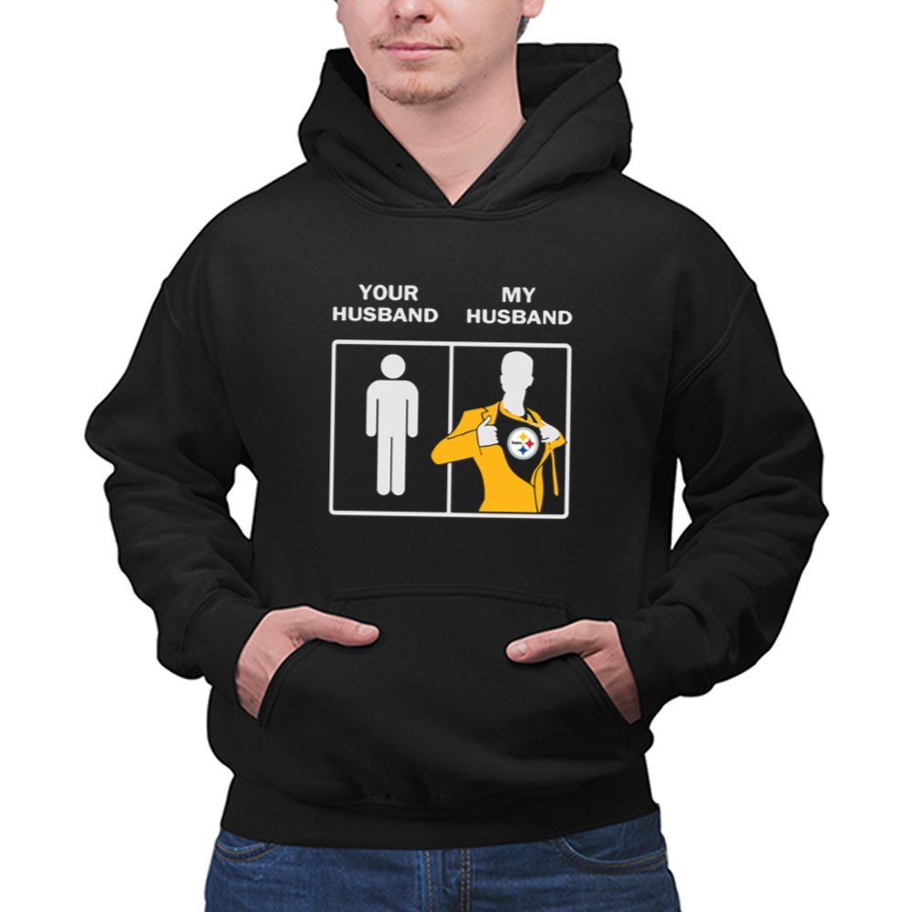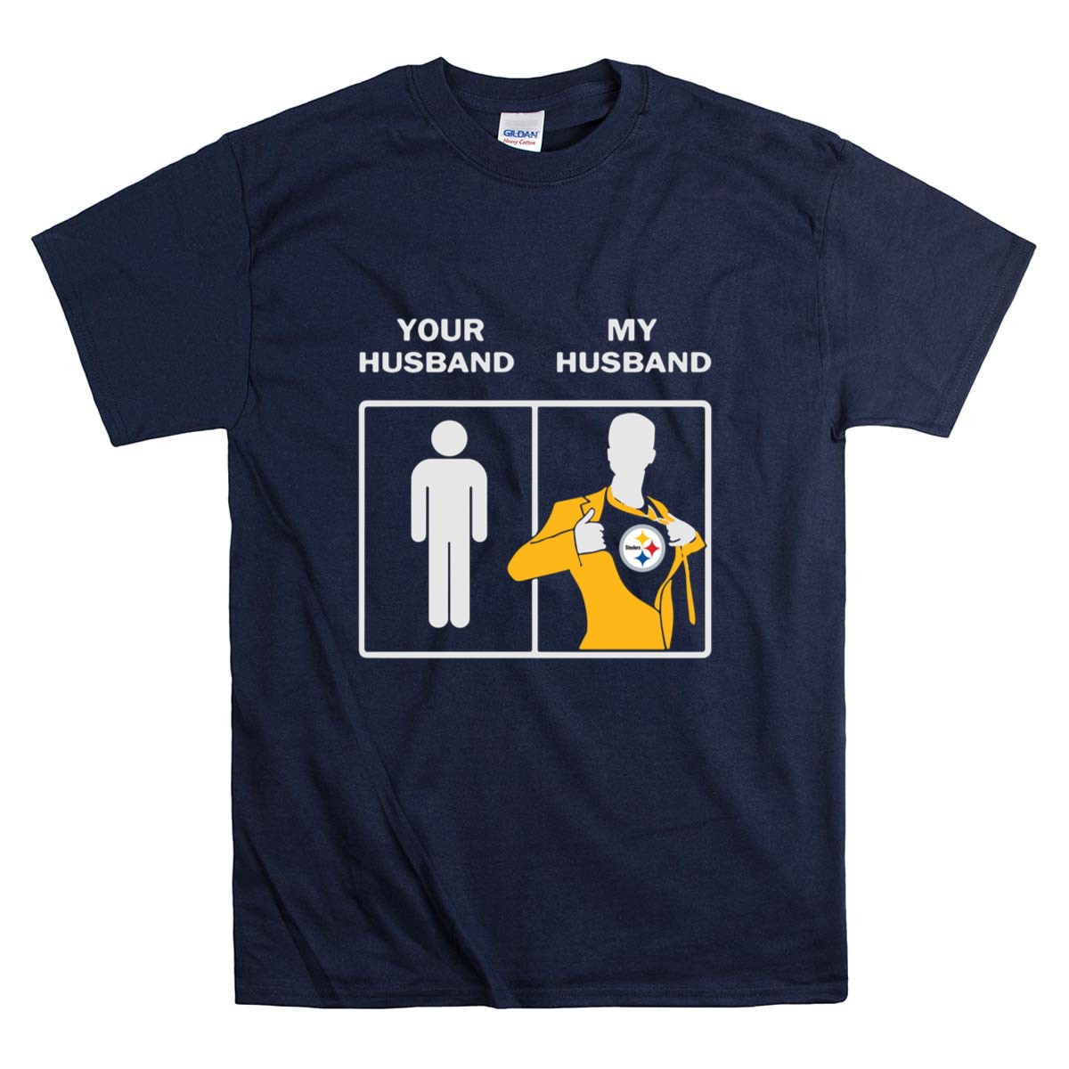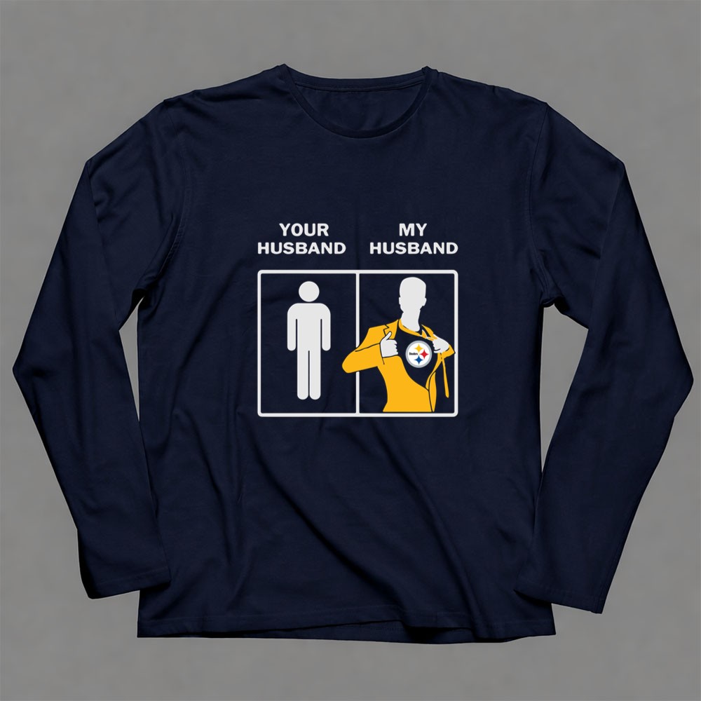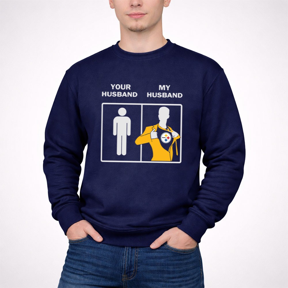 This design playfully captures the essence of Steelers fandom by displaying the phrase ‘YOUR HUSBAND, MY HUSBAND’ alongside a bold graphic of a man revealing the iconic Pittsburgh Steelers logo. It’s a lighthearted nod to the dedication and camaraderie that defines the football-loving community, making it a perfect expression of love for both the game and each other.